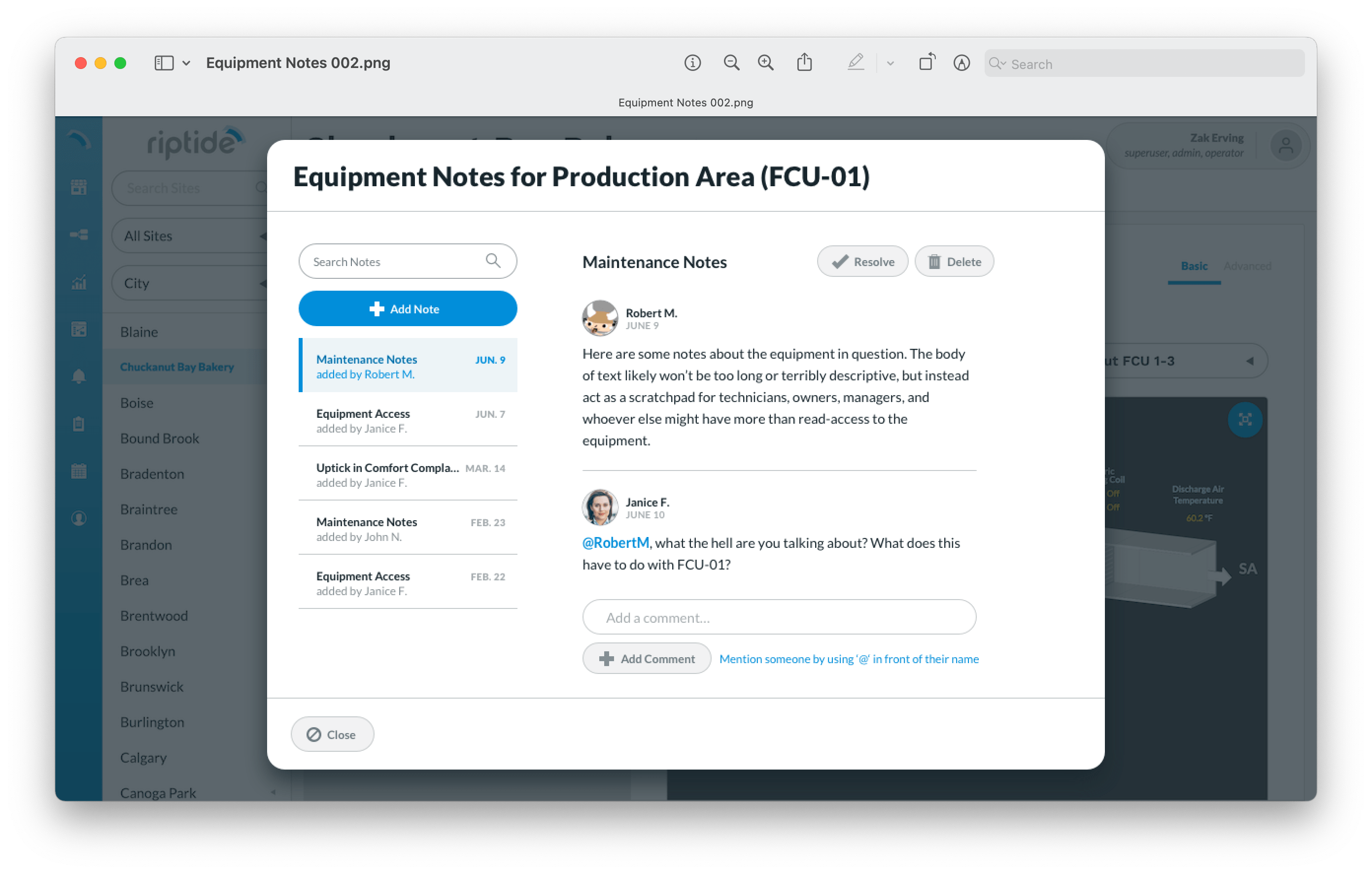 Building managers like to have a visual representation of the equipment in their building, as it allows them to quickly identify problem areas within a system, as well as anticipate future maintenance needs. Unfortunately, antiquated off-the-shelf libraries stood in stark contrast against Maya's clean aesthetic, and their uncompressed size created significant technical debt. Unfortunately, the legacy equipment graphics library used by Riptide was not only dated in its appearance, it relied heavily on the GIF file format to display animations of equipment at various states, creating significant technical debt and crippling browsers. We elected to use an isometric projection of generic pieces of equipment, rendered in SVG. This proved beneficial not just in file size (many graphics were less than 1kb), but it allowed us to control animation speeds programmatically.